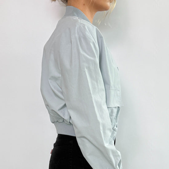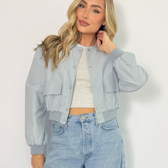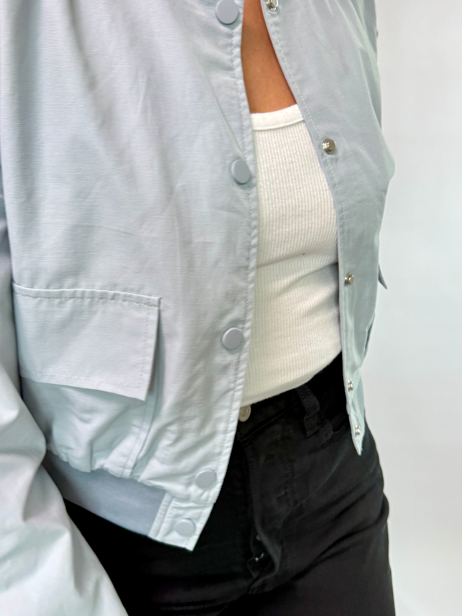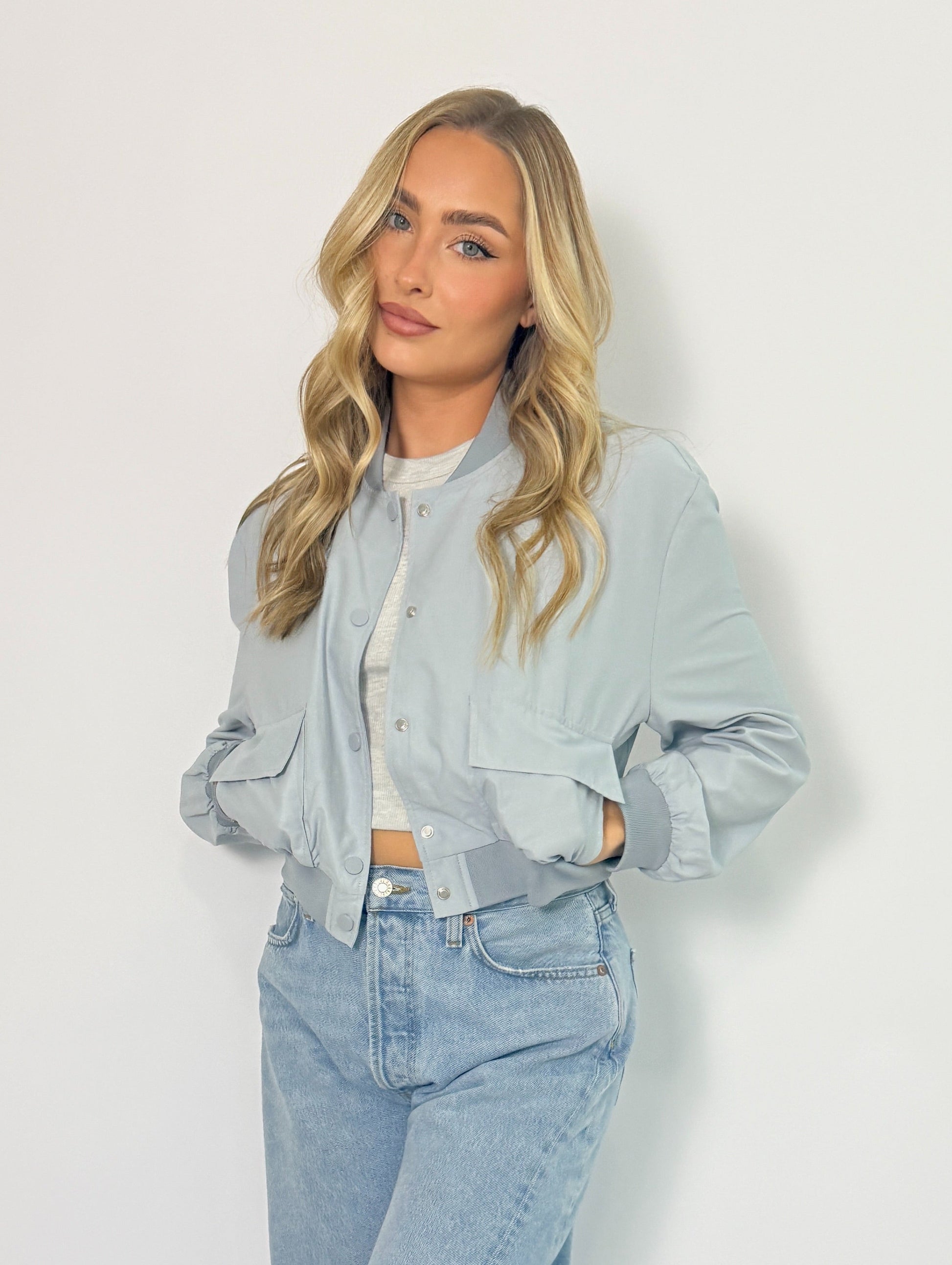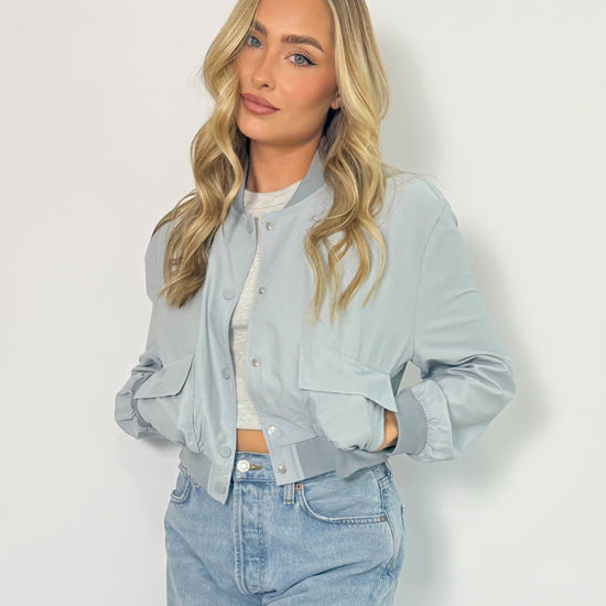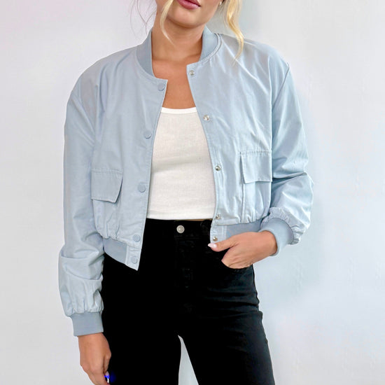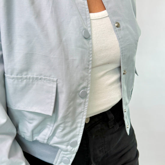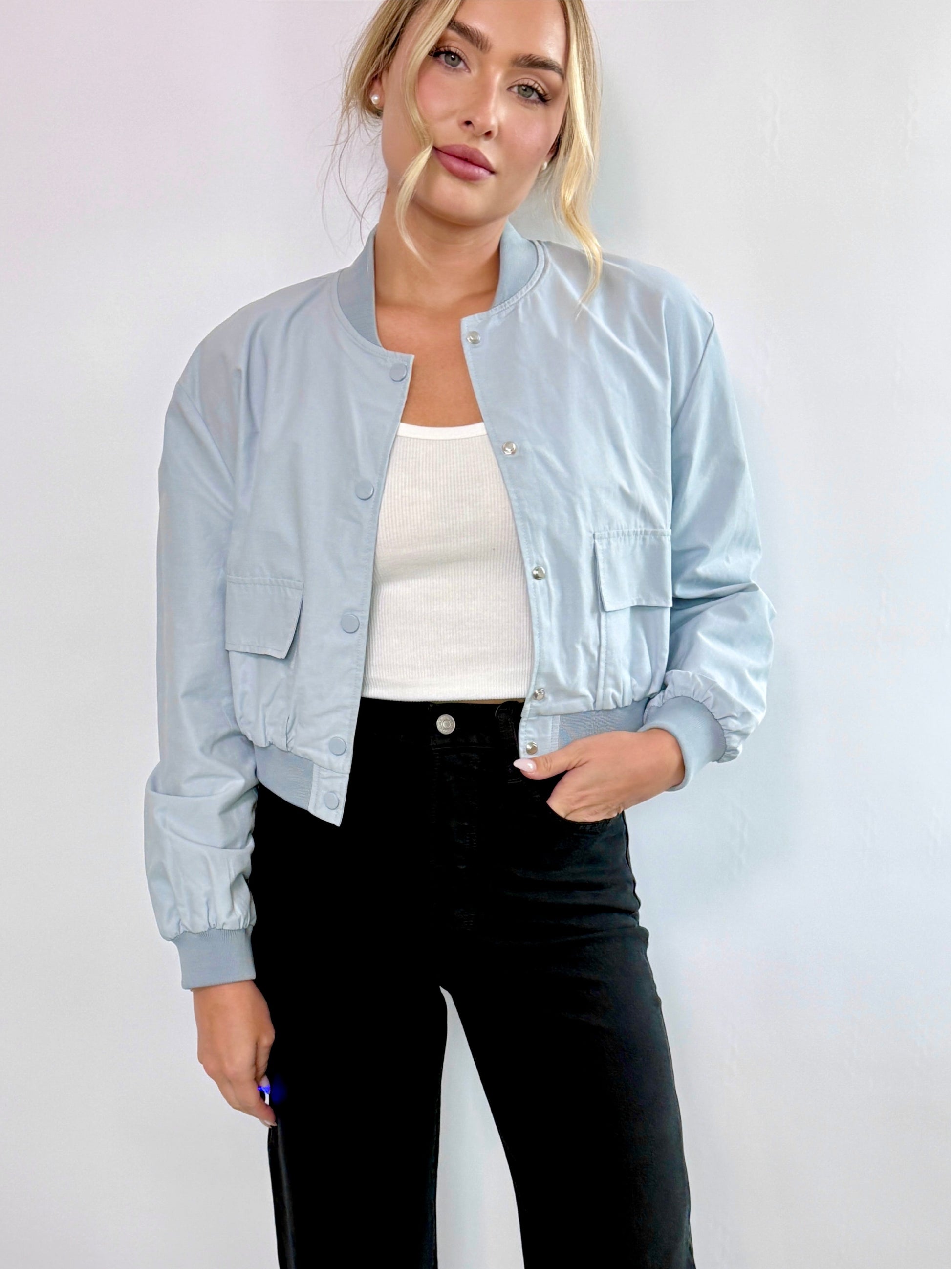 The Lila Bomber Jacket is a versatile and stylish addition to any wardrobe. Its lightweight design and light blue color make it perfect for layering in any season. Whether dressing up or going for a more casual look, this jacket will elevate any outfit.